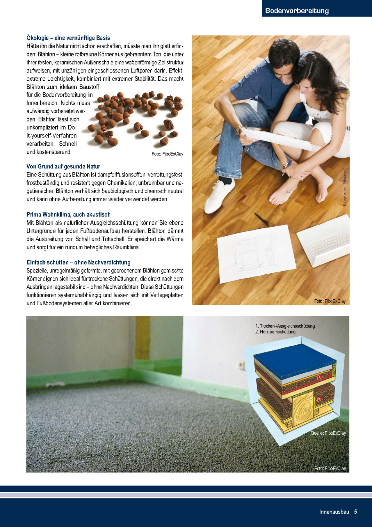 INHALT: Bodenvorbereitung Ökologie eine vernünftige Basis Hätte ihn die Natur nicht schon erschaffen, müsste man ihn glatt erfinden: Blähton kleine rotbraune Körner aus gebranntem Ton, die unter ihrer festen, keramischen Außenschale eine wabenförmige Zellstruktur aufweisen, mit unzähligen eingeschlossenen Luftporen darin. Effekt: extreme Leichtigkeit, kombiniert mit extremer Stabilität. Das macht Blähton zum idelaen Baustoff für die Bodenvorbereitung im Innenbereich. Nichts muss aufwändig vorbereitet werden, Blähton lässt sich unkompliziert im Doit-yourself-Verfahren verarbeiten. Schnell und kostensparend. Foto: FiboExClay (© diego cervo - Fotolia.com) Von Grund auf gesunde Natur Eine Schüttung aus Blähton ist dampfdiffusionsoffen, verrottungsfest, frostbeständig und resistent gegen Chemikalien, unbrennbar und nagetiersicher. Blähton verhält sich baubiologisch und chemisch neutral und kann ohne Aufbereitung immer wieder verwendet werden. Prima Wohnklima, auch akustisch Mit Blähton als natürlicher Ausgleichsschüttung können Sie ebene Untergründe für jeden Fußbodenaufbau herstellen. Blähton dämmt die Ausbreitung von Schall und Trittschall. Er speichert die Wärme und sorgt für ein rundum behagliches Raumklima. Einfach schütten ohne Nachverdichtung Spezielle, unregelmäßig geformte, mit gebrochenem Blähton gemischte Körner eignen sich ideal für trockene Schüttungen, die direkt nach dem Ausbringen lagestabil sind ohne Nachverdichten. Diese Schüttungen funktionieren systemunabhängig und lassen sich mit Verlegeplatten und Fußbodensystemen aller Art kombinieren. Foto: FiboExClay 1. Trocken-/Ausgleichsschüttung 2. Hohlraumschüttung Quelle: FiboExClay Foto: FiboExClay Innenausbau 5 5